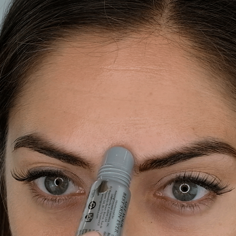 Squeeze a small amount of product out of the tube and use the roller ball applicator to apply onto skin. Use your fingers to pat the product in and blend out.